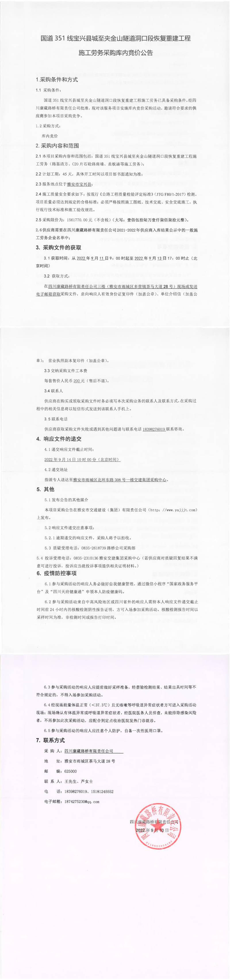 四川康藏路橋有限責(zé)任公司國道351線寶興縣城至夾金山隧道洞口段恢復(fù)重建工程施工勞務(wù)采購庫內(nèi)競價公告