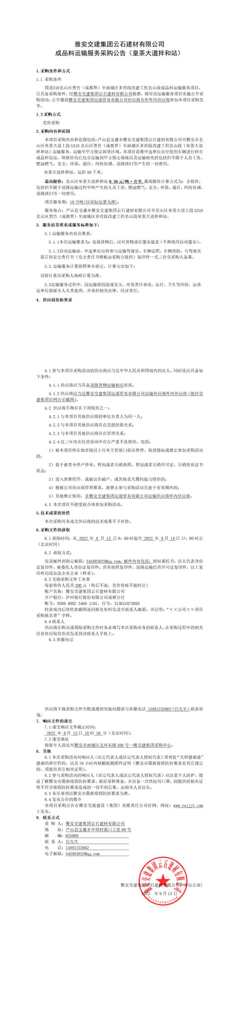 雅安交建集團(tuán)云石建材有限公司成品料運(yùn)輸服務(wù)采購公告(皇茶大道拌和站)