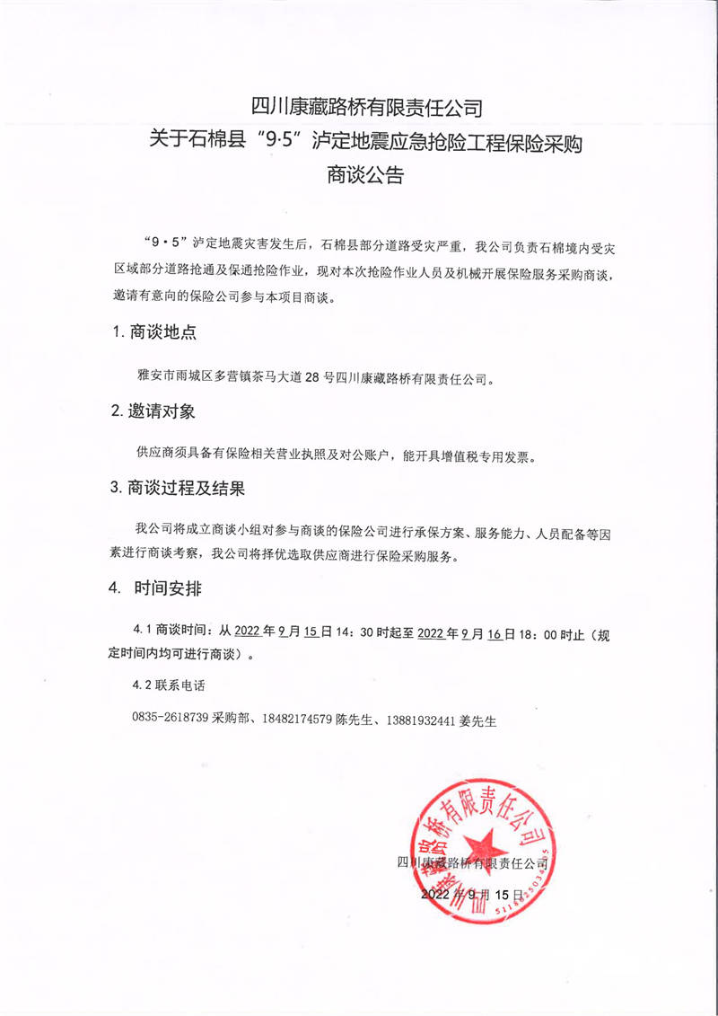 四川康藏路橋有限責(zé)任公司關(guān)于石棉縣“9·5”瀘定地震應(yīng)急搶險(xiǎn)工程保險(xiǎn)采購(gòu)商談公告