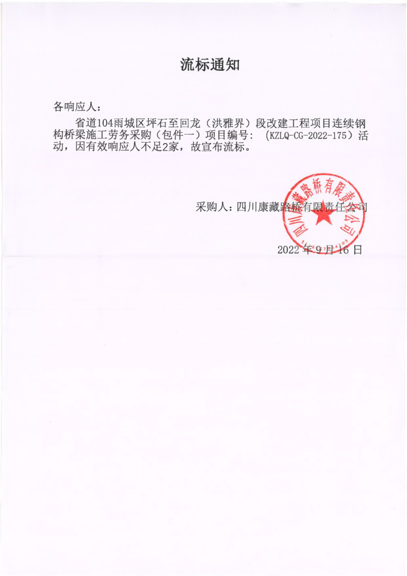四川康藏路橋有限責任公司省道104雨城區(qū)坪石至回龍(洪雅界)段改建工程項目連續(xù)鋼構橋梁施工勞務采購(包件一)流標通知