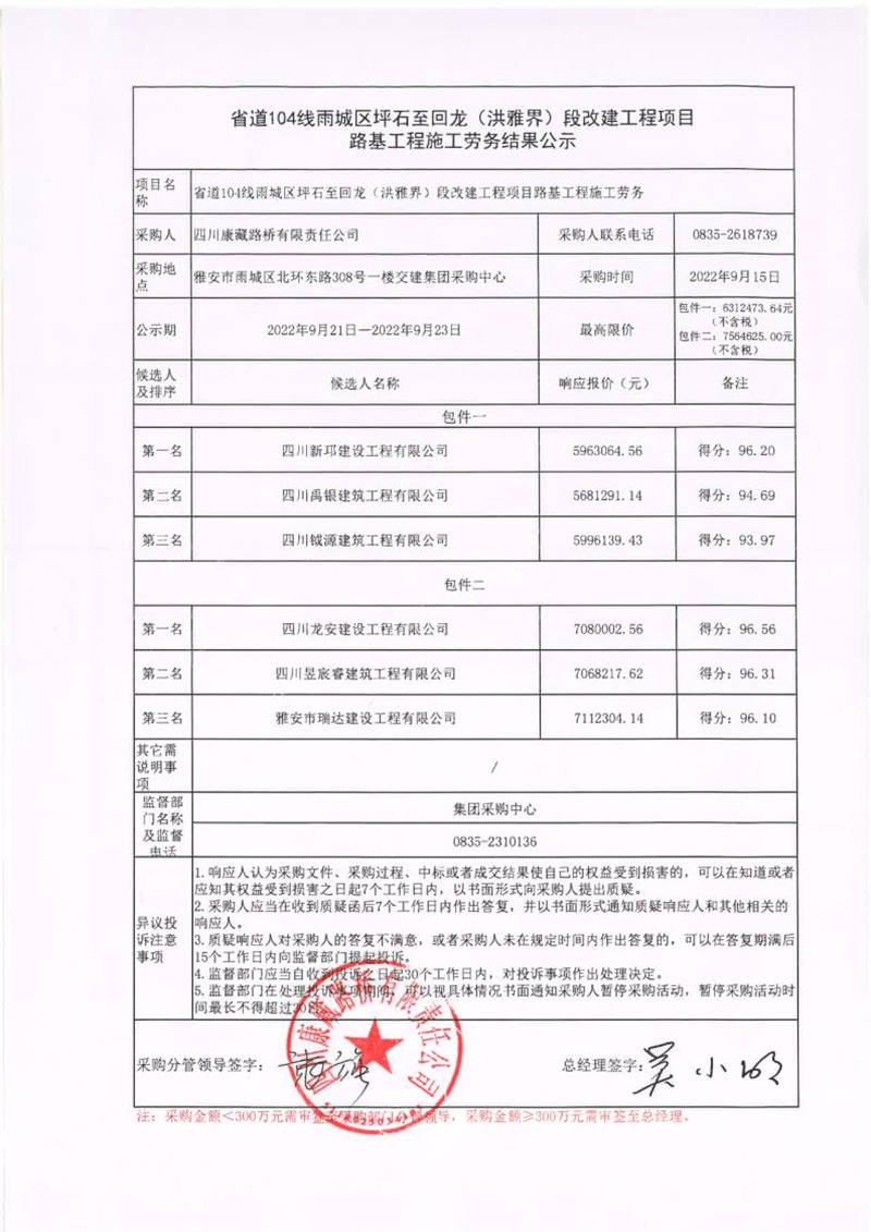 四川康藏路橋有限責(zé)任公司省道104線雨城區(qū)坪石至回龍(洪雅界)段改建工程項(xiàng)目路基工程施工勞務(wù)結(jié)果公示