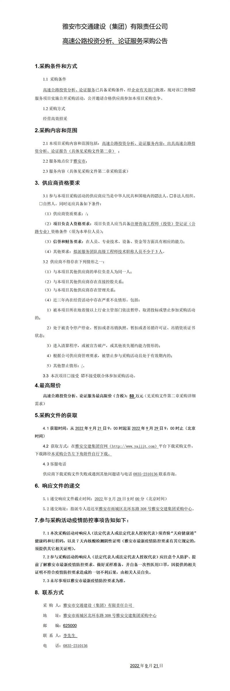 雅安市交通建設(shè)(集團)有限責任公司高速公路投資分析、論證服務(wù)采購公告