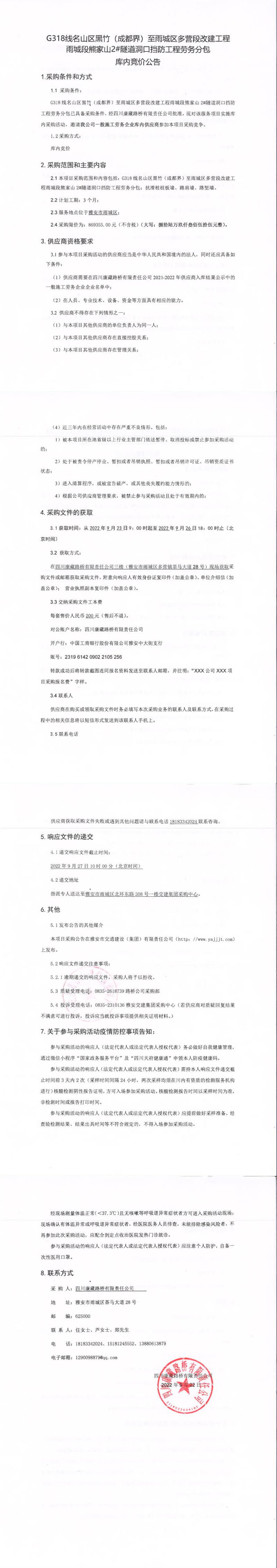 四川康藏路橋有限責(zé)任公司G318線名山區(qū)黑竹(成都界)至雨城區(qū)多營(yíng)段改建工程雨城段熊家山2#隧道洞口擋防工程勞務(wù)分包庫內(nèi)競(jìng)價(jià)公告