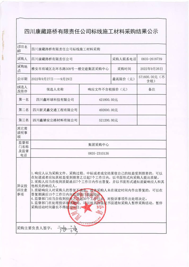 四川康藏路橋有限責任公司標線施工材料采購結果公示