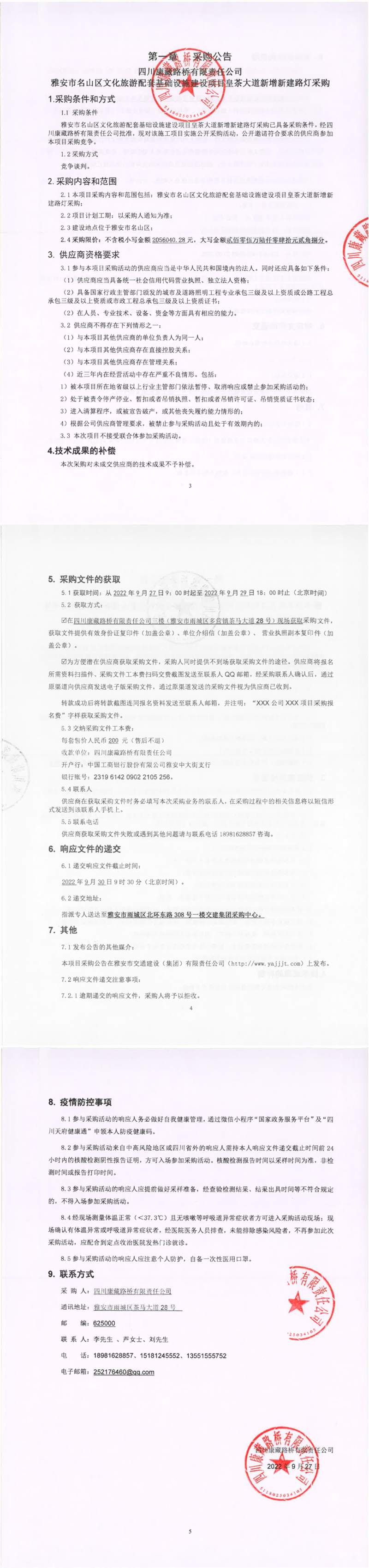四川康藏路橋有限責任公司雅安市名山區(qū)文化旅游配套基礎設施建設項目皇茶大道新增新建路燈采購公告