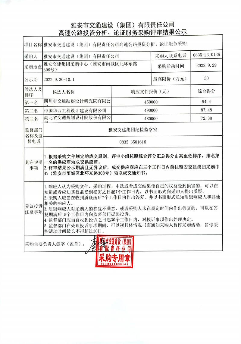 雅安市交通建設(shè)(集團(tuán))有限責(zé)任公司高速公路投資分析、論證服務(wù)采購(gòu)評(píng)審結(jié)果公示