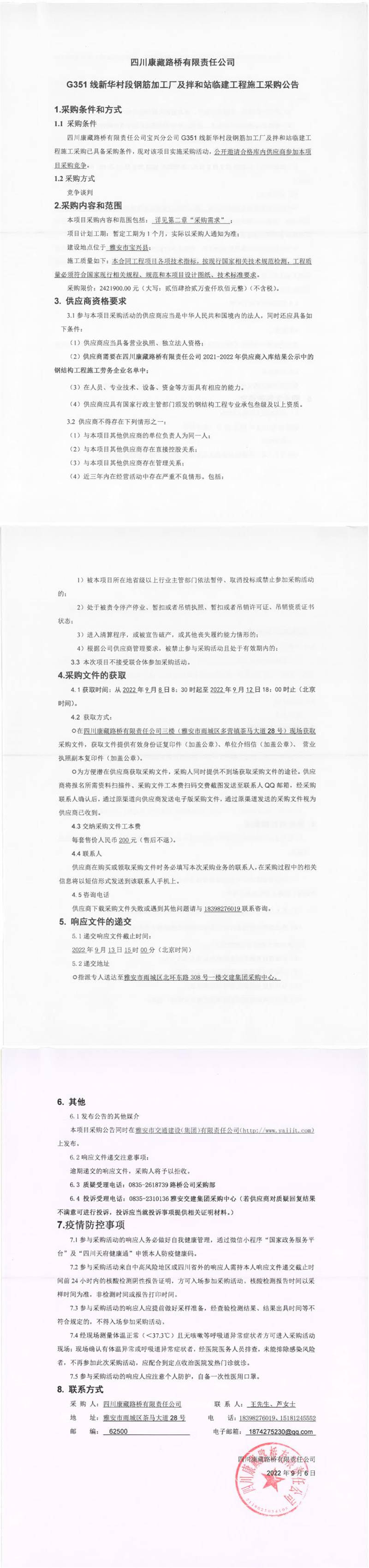 四川康藏路橋有限責任公司G351線新華村段鋼筋加工廠及拌和站臨建工程施工采購公告