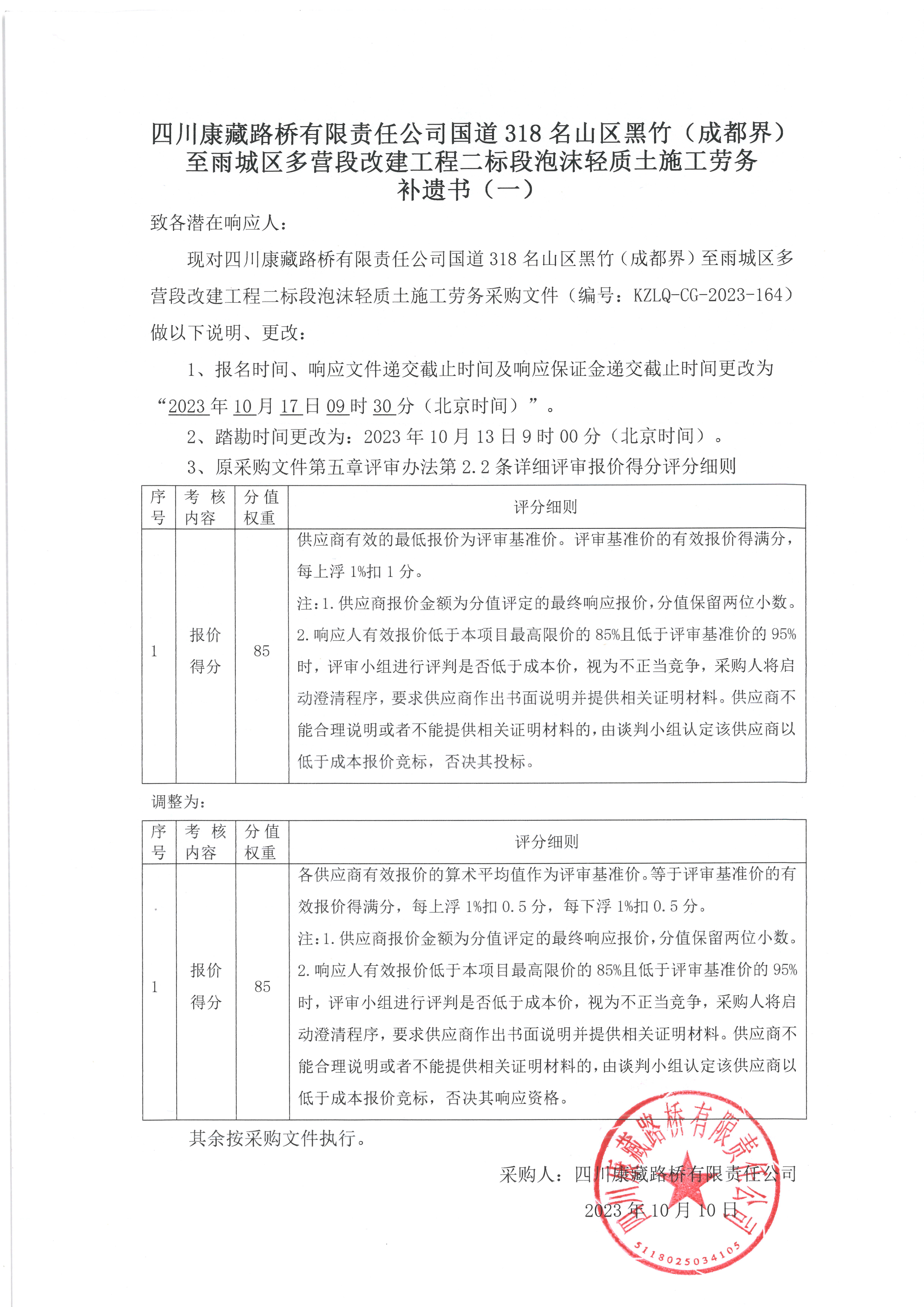 四川康藏路橋有限責任公司國道318名山區(qū)黑竹(成都界)至雨城區(qū)多營段改建工程二標段泡沫輕質(zhì)土施工勞務(wù)補遺書(一)
