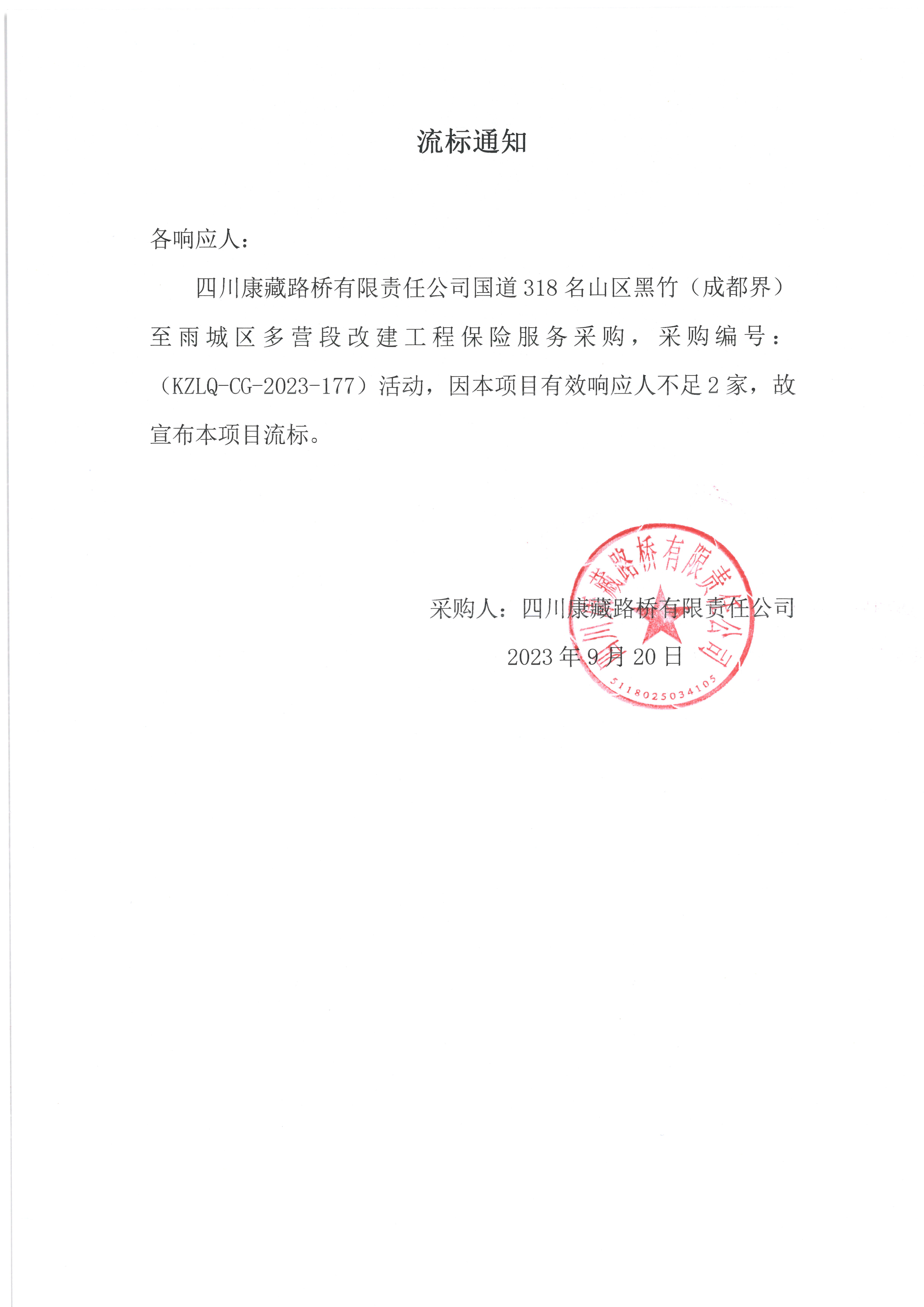 四川康藏路橋有限責(zé)任公司國道318名山區(qū)黑竹(成都界)至雨城區(qū)多營段改建工程保險(xiǎn)服務(wù)采購流標(biāo)通知