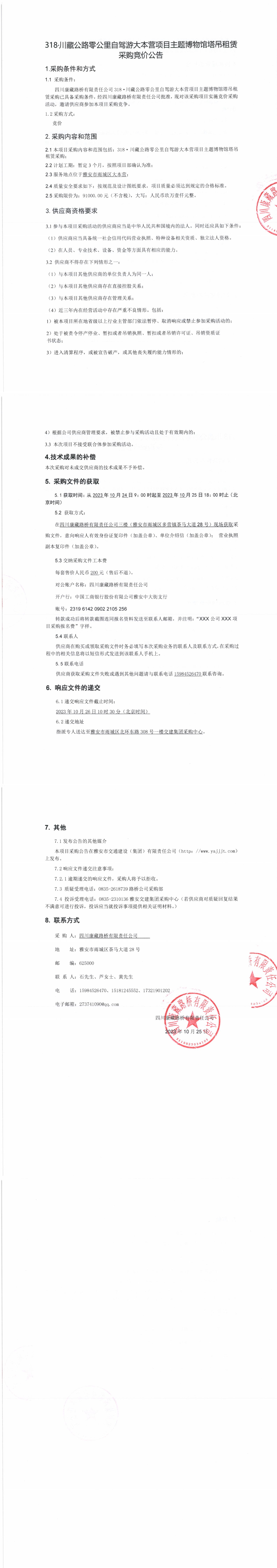 四川康藏路橋有限責任公司318·川藏公路零公里自駕游大本營項目主題博物館塔吊租賃采購競價公告