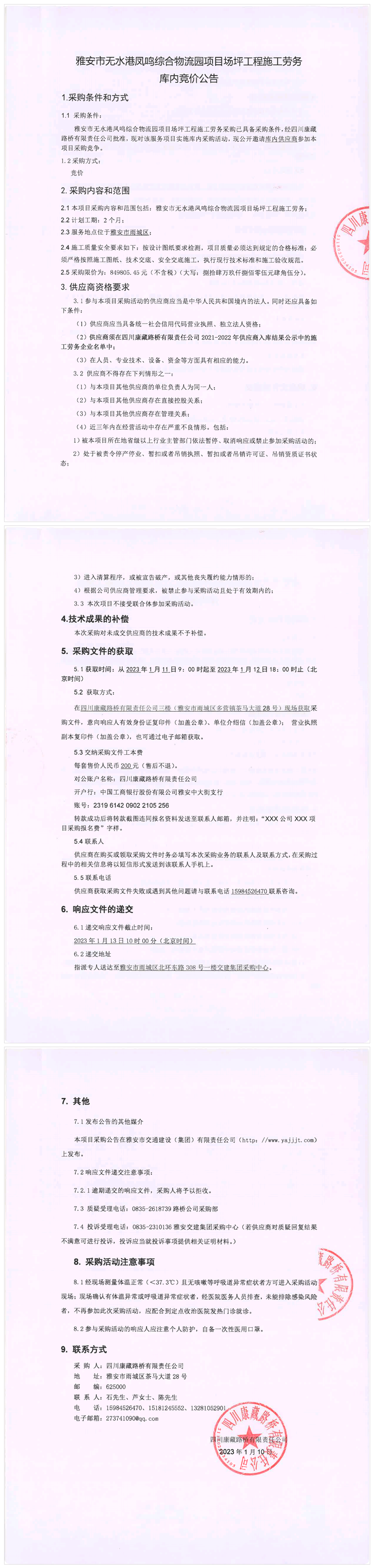 四川康藏路橋有限責任公司雅安市無水港鳳鳴綜合物流園項目場坪工程施工勞務庫內(nèi)競價公告