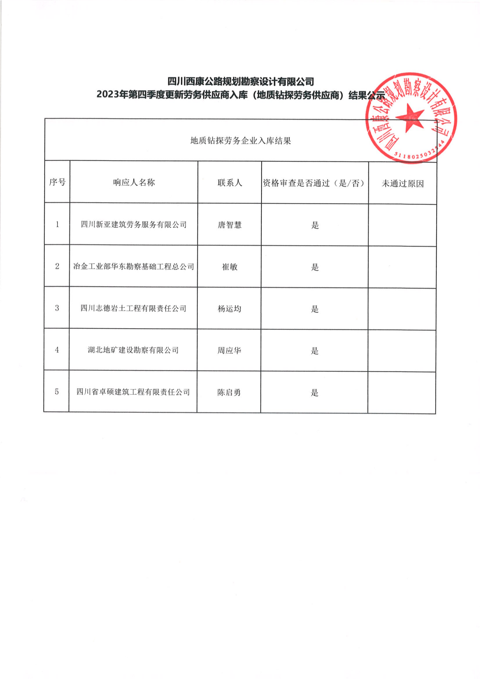 四川西康公路規(guī)劃勘察設(shè)計有限公司2023年第四季度更新勞務(wù)供應(yīng)商入庫(地質(zhì)鉆探勞務(wù)供應(yīng)商)結(jié)果公示