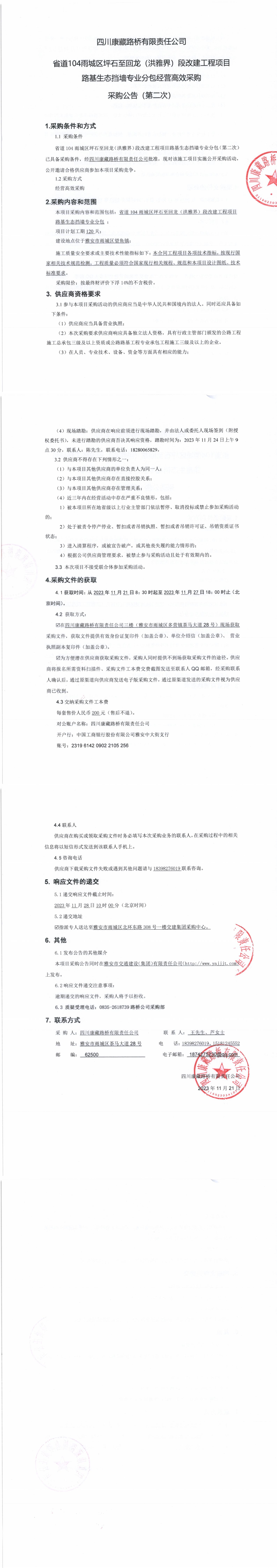 四川康藏路橋有限責任公司省道104雨城區(qū)坪石至回龍(洪雅界)段改建工程項目路基生態(tài)擋墻專業(yè)分包經(jīng)營高效采購(第二次)采購公告