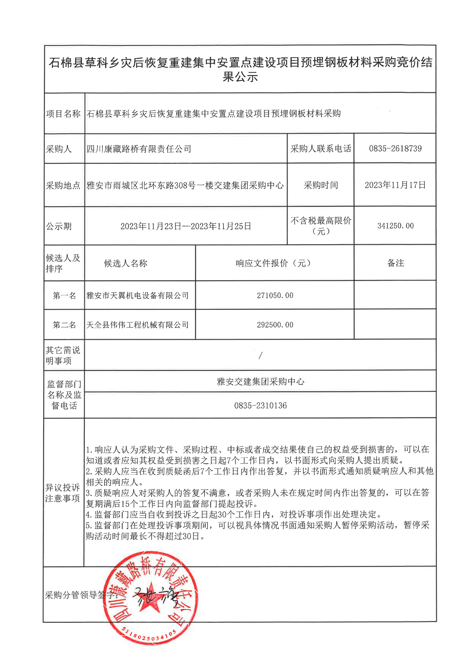 四川康藏路橋有限責(zé)任公司石棉縣草科鄉(xiāng)災(zāi)后恢復(fù)重建集中安置點建設(shè)項目預(yù)埋鋼板材料采購結(jié)果公示