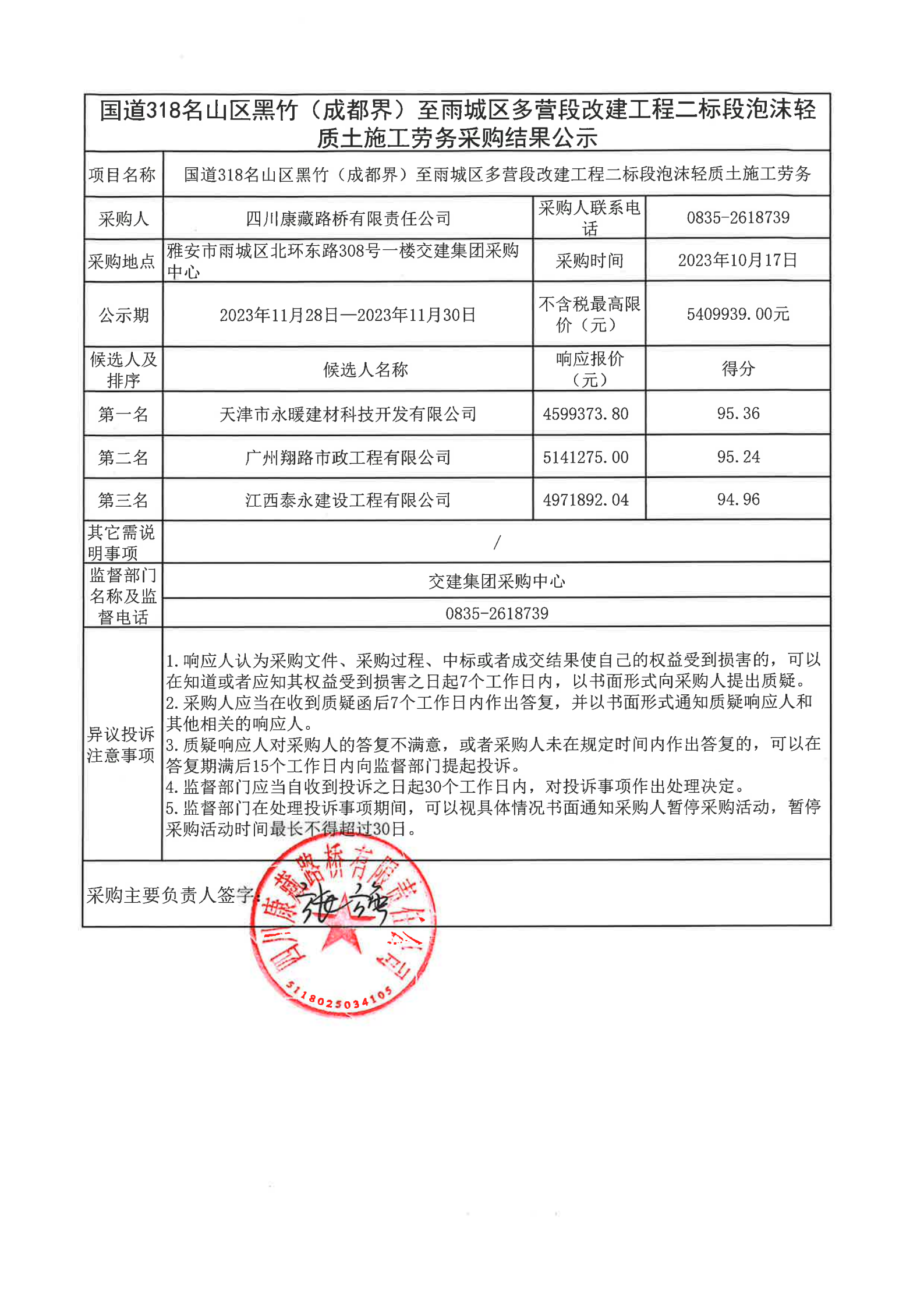 四川康藏路橋有限責任公司國道318名山區(qū)黑竹(成都界)至雨城區(qū)多營段改建工程二標段泡沫輕質土施工勞務采購結果公示