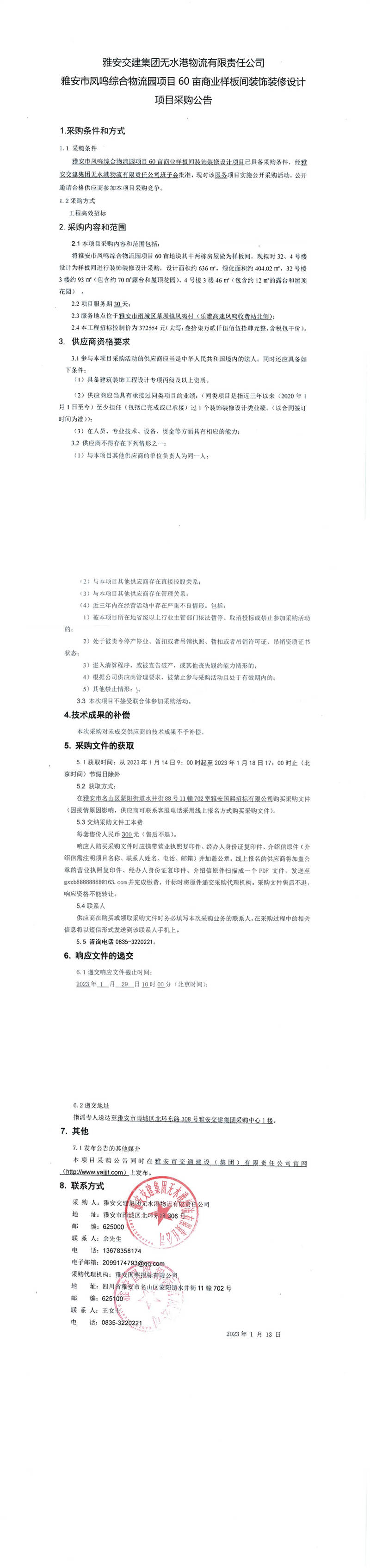 雅安交建集團(tuán)無水港物流有限責(zé)任公司雅安市鳳鳴綜合物流園項(xiàng)目60畝商業(yè)樣板間裝飾裝修設(shè)計(jì)項(xiàng)目采購公告