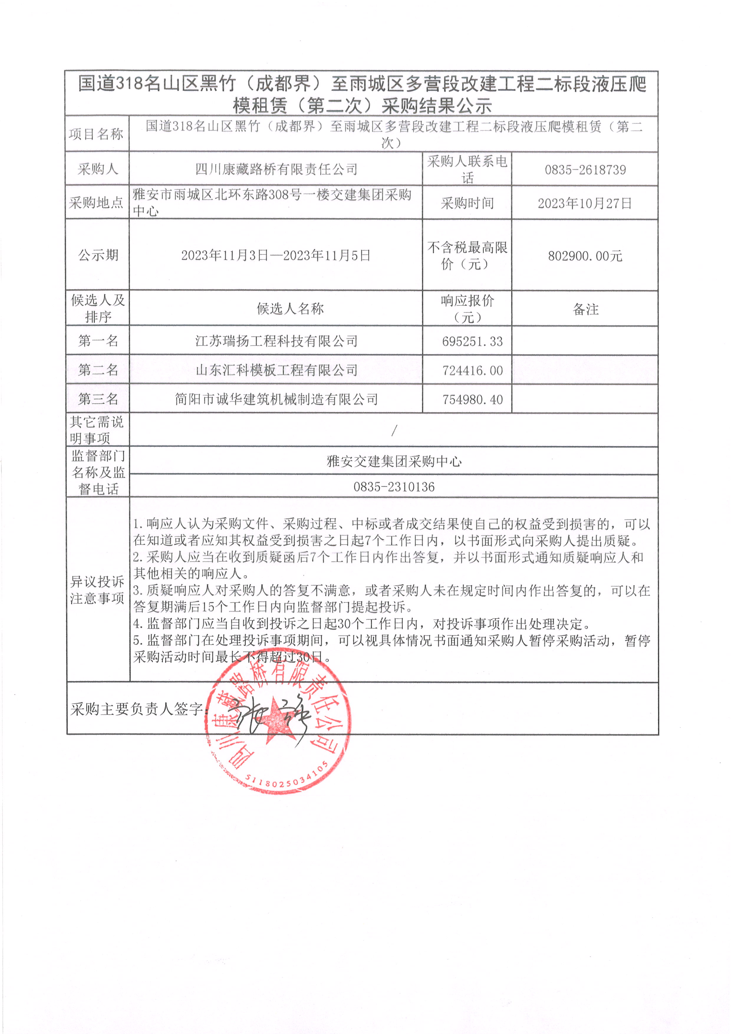 四川康藏路橋有限責(zé)任公司國道318名山區(qū)黑竹(成都界)至雨城區(qū)多營段改建工程二標(biāo)段液壓爬模租賃(第二次)采購結(jié)果公示