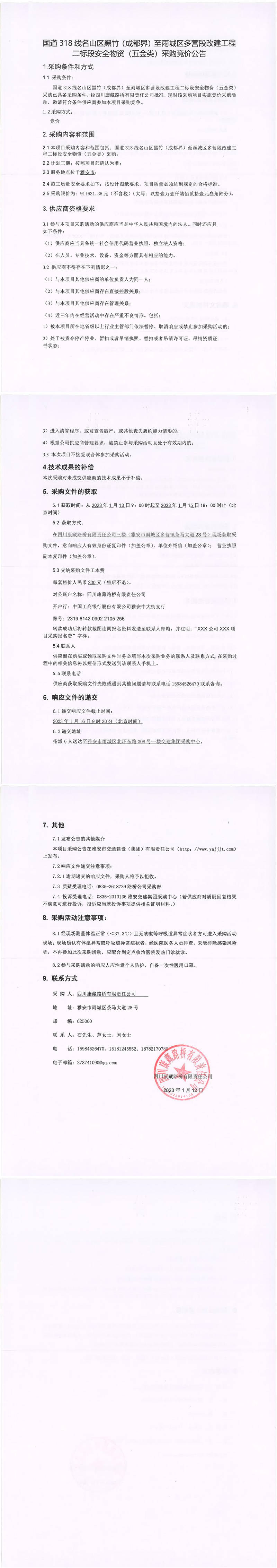四川康藏路橋有限責任公司國道318線名山區(qū)黑竹(成都界)至雨城區(qū)多營段改建工程二標段安全物資(廣告類)采購競價公告