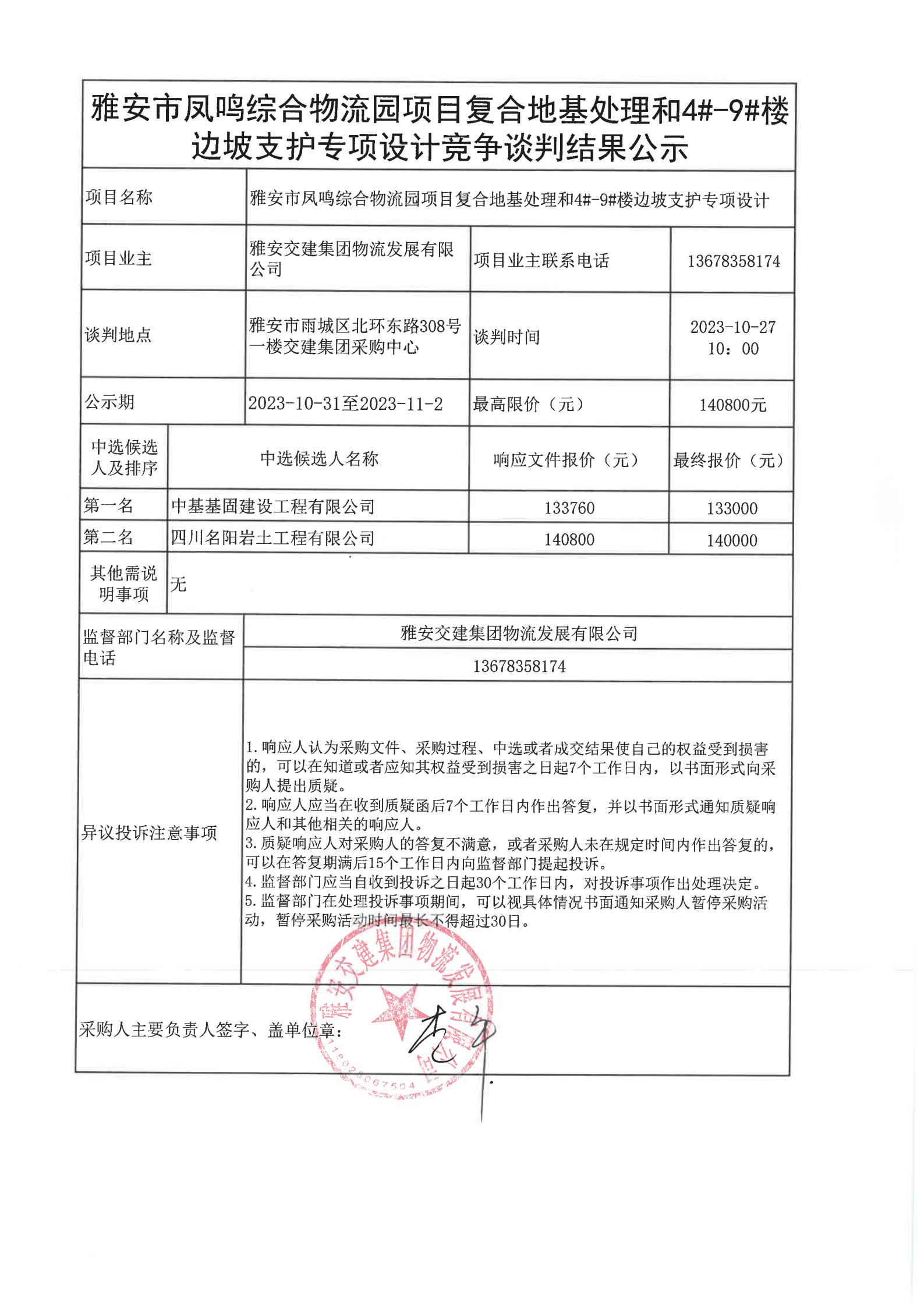雅安交建集團(tuán)物流發(fā)展有限公司雅安市鳳鳴綜合物流園項(xiàng)目復(fù)合地基處理和4#-9#樓邊坡支護(hù)專項(xiàng)設(shè)計(jì)競爭談判結(jié)果公示