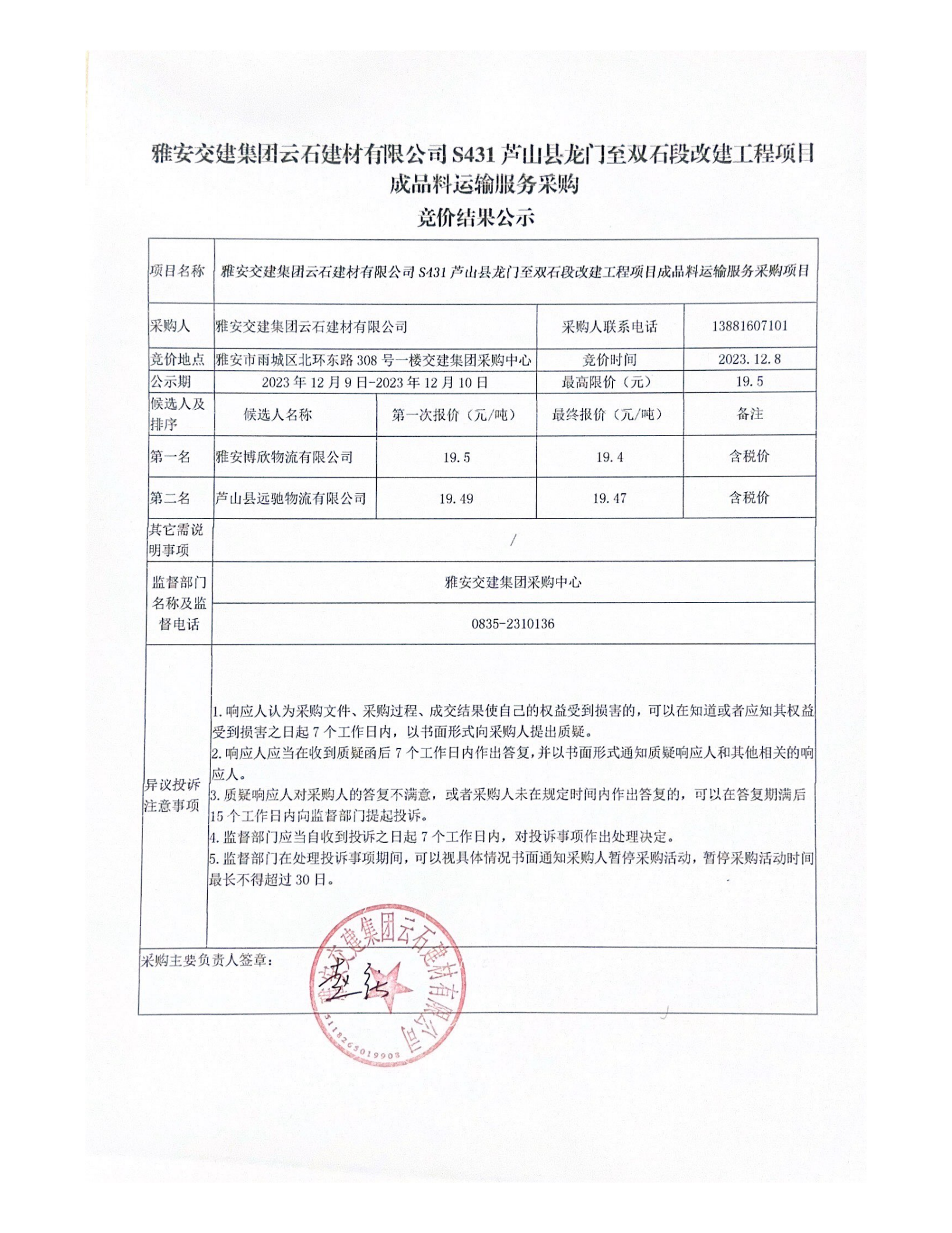 雅安交建集團(tuán)云石建材有限公司S431蘆山縣龍門至雙石段改建工程項(xiàng)目成品料運(yùn)輸服務(wù)采購競價(jià)結(jié)果公示