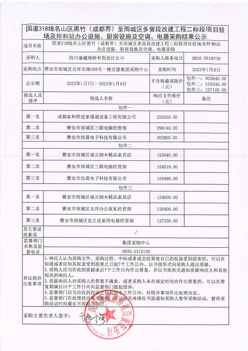 四川康藏路橋有限責(zé)任公司國道318線名山區(qū)黑竹(成都界)至雨城區(qū)多營段改建工程二標(biāo)段項(xiàng)目駐場(chǎng)及拌和站辦公設(shè)施、廚房設(shè)施及空調(diào)、電器采購結(jié)果公示