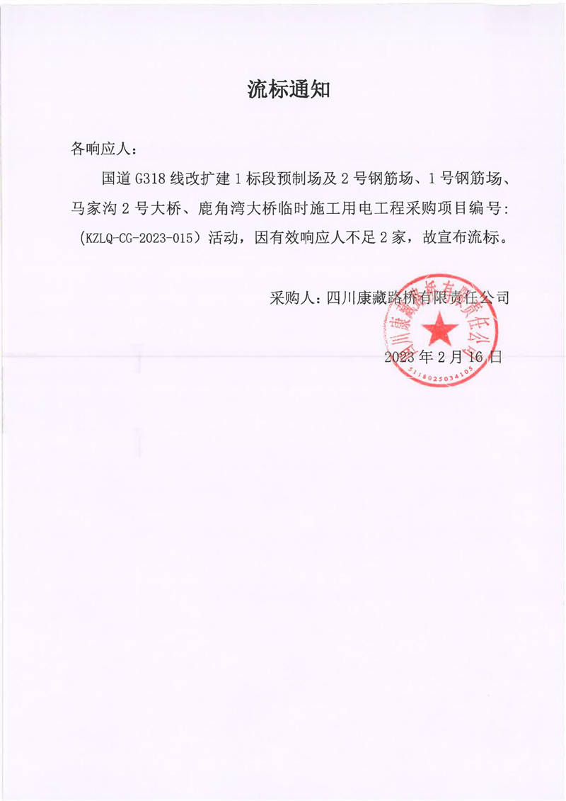 四川康藏路橋有限責(zé)任公司國道G318線改擴(kuò)建1標(biāo)段預(yù)制場及2號鋼筋場、1號鋼筋場、馬家溝2號大橋、鹿角灣大橋臨時施工用電工程采購項目流標(biāo)通知