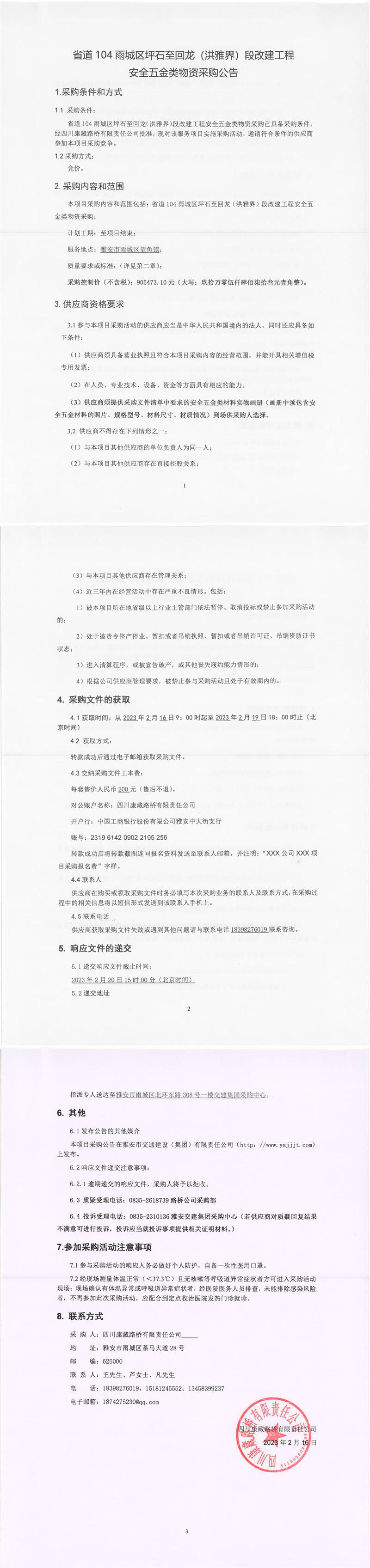 四川康藏路橋有限責(zé)任公司省道104雨城區(qū)坪石至回龍(洪雅界)段改建工程安全五金類物資采購(gòu)公告