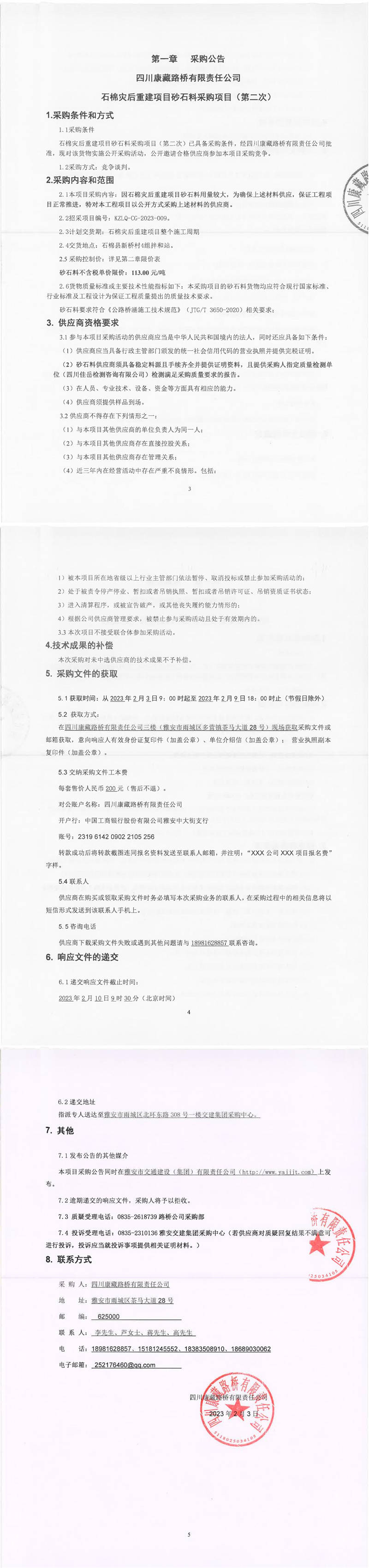 四川康藏路橋有限責任公司石棉災(zāi)后重建項目砂石料采購項目(第二次)采購公告