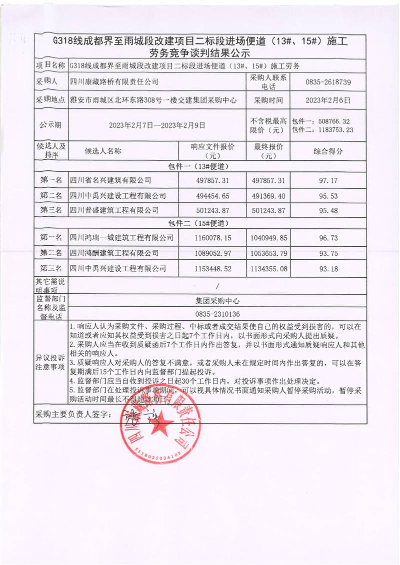 四川康藏路橋有限責(zé)任公司G318線成都界至雨城段改建項目二標(biāo)段進(jìn)場便道(13#、15#)施工勞務(wù)競爭談判結(jié)果公示