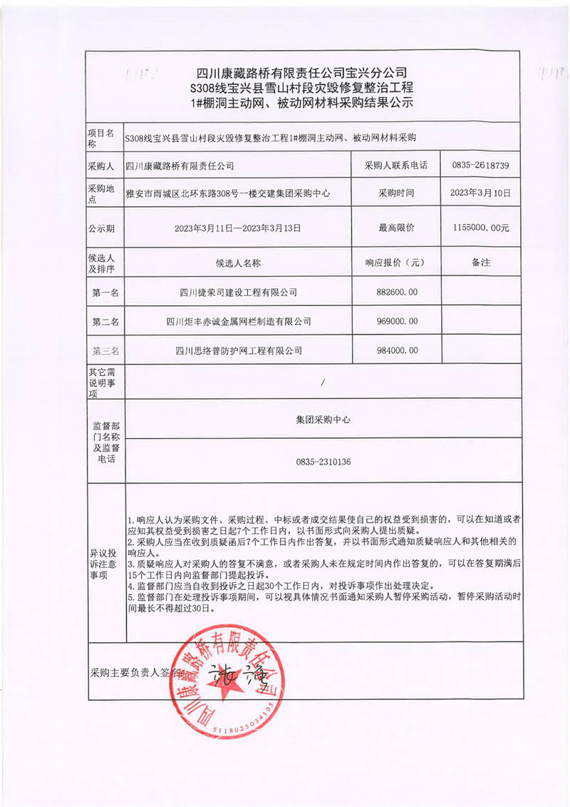 四川康藏路橋有限責(zé)任公司寶興分公司S308線寶興縣雪山村段災(zāi)毀修復(fù)整治工程1#棚洞主動(dòng)網(wǎng)、被動(dòng)網(wǎng)材料采購結(jié)果公示