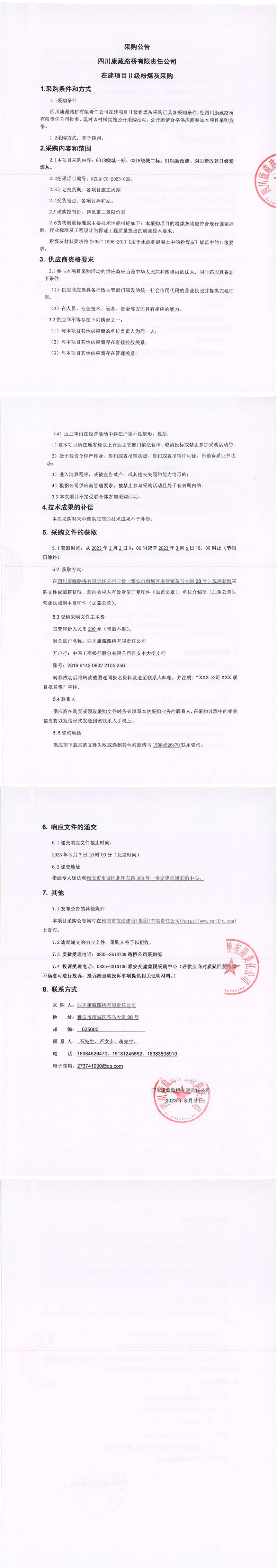 四川康藏路橋有限責(zé)任公司在建項(xiàng)目Ⅱ級(jí)粉煤灰采購公告
