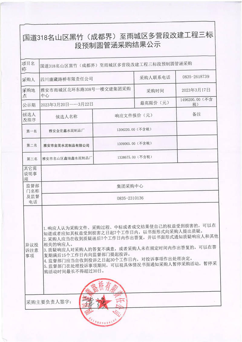 四川康藏路橋有限責(zé)任公司國道318名山區(qū)黑竹(成都界)至雨城區(qū)多營段改建工程三標(biāo)段預(yù)制圓管涵采購結(jié)果公示