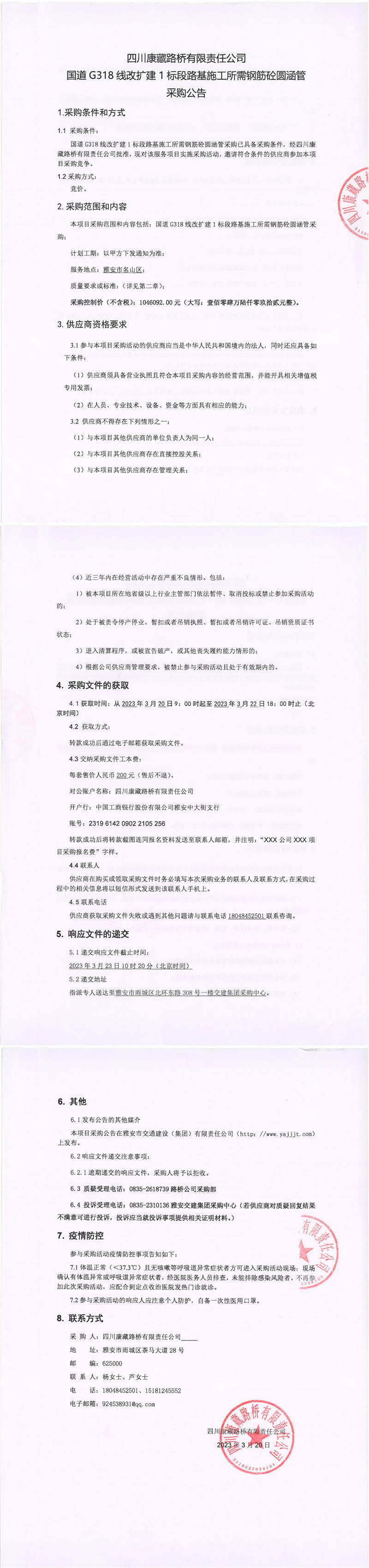 四川康藏路橋有限責(zé)任公司國(guó)道G318線改擴(kuò)建1標(biāo)段路基施工所需鋼筋砼圓涵管采購公告