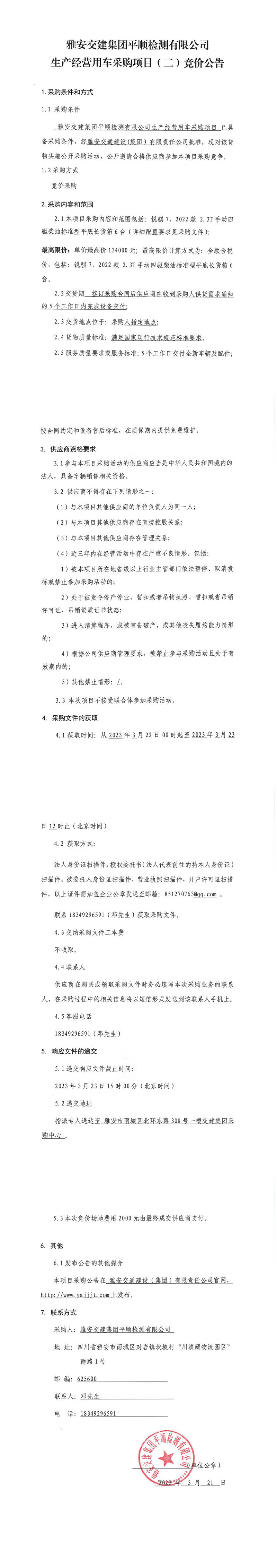 雅安交建集團(tuán)平順檢測(cè)有限公司平順公司生產(chǎn)經(jīng)營(yíng)用車采購(gòu)項(xiàng)目(二)競(jìng)價(jià)公告