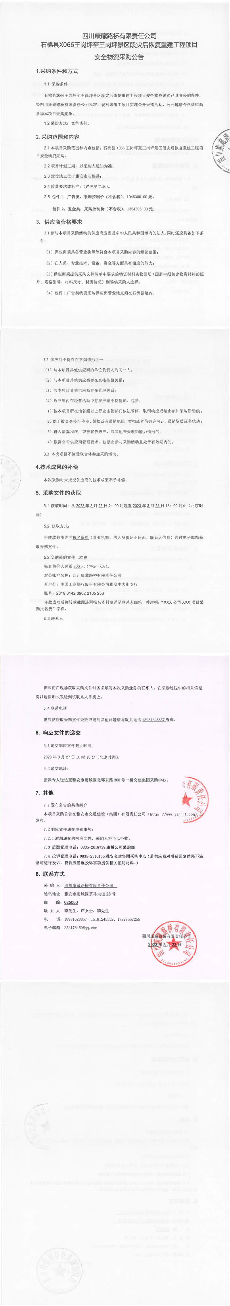 四川康藏路橋有限責(zé)任公司石棉縣X066王崗坪至王崗坪景區(qū)段災(zāi)后恢復(fù)重建工程項(xiàng)目安全物資采購公告