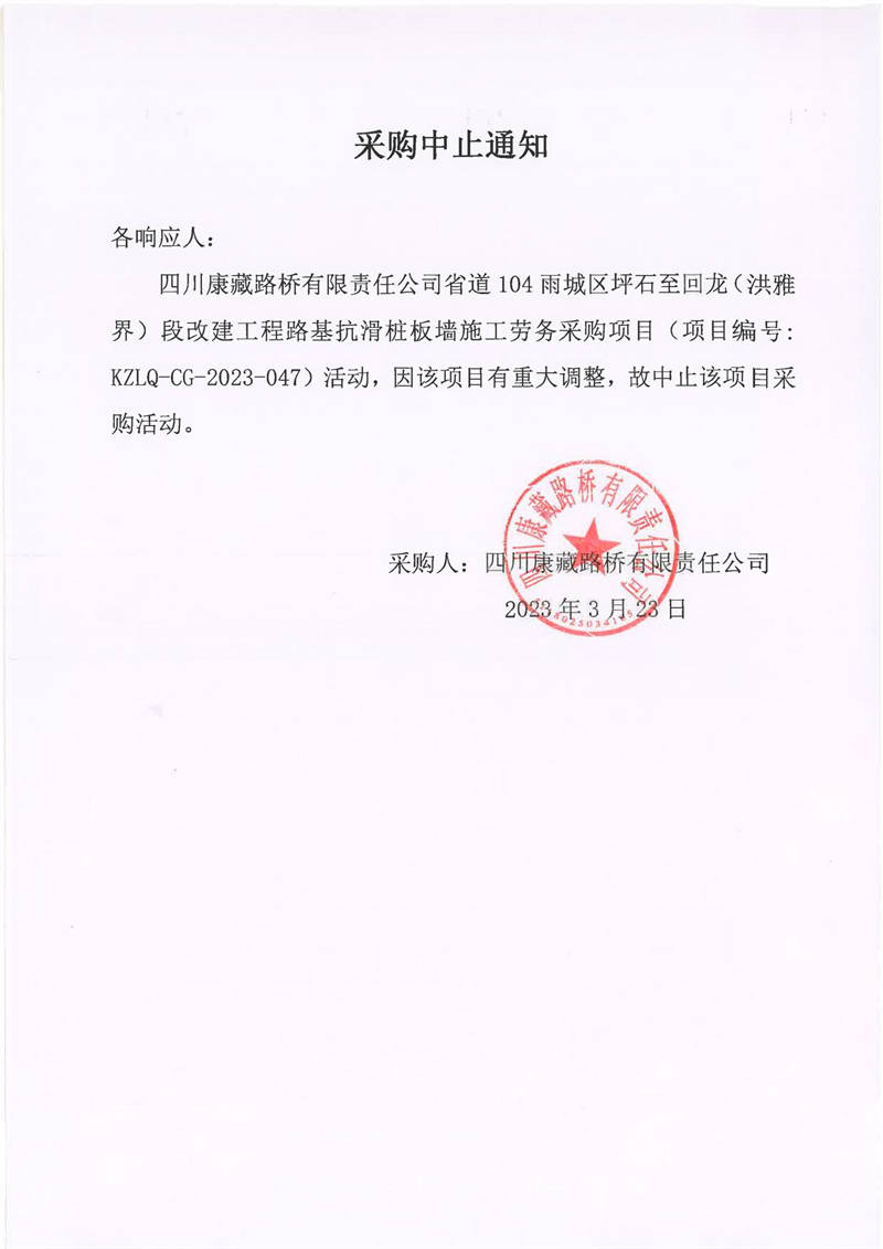 四川康藏路橋有限責(zé)任公司省道104雨城區(qū)坪石至回龍(洪雅界)段改建工程路基抗滑樁版墻施工勞務(wù)采購(gòu)終止通知