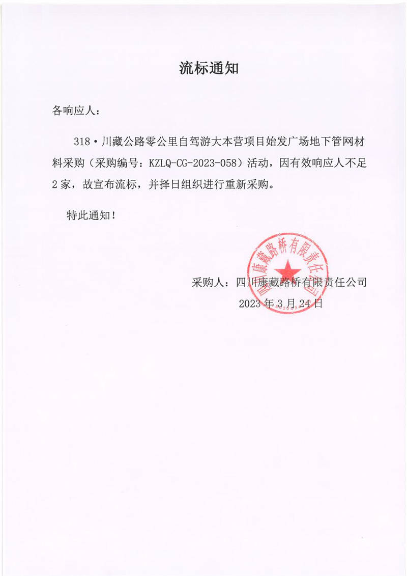 四川康藏路橋有限責任公司318·川藏公路零公里自駕游大本營項目始發(fā)廣場地下管網材料采購流標通知