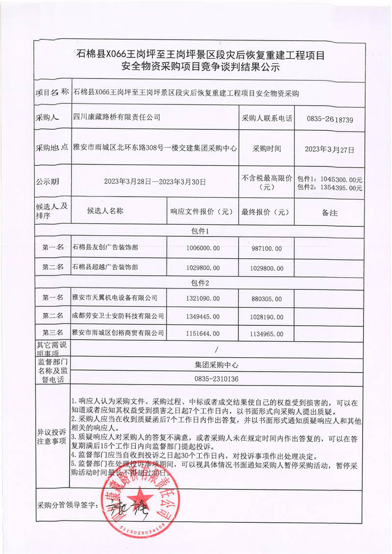 四川康藏路橋有限責(zé)任公司石棉縣X066王崗坪至王崗坪景區(qū)段災(zāi)后恢復(fù)重建工程項目安全物資采購項目競爭談判結(jié)果公示