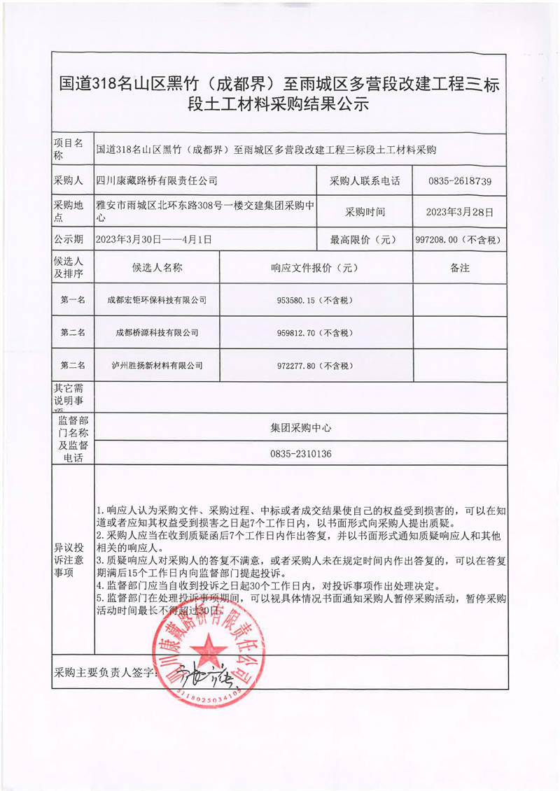 四川康藏路橋有限責(zé)任公司國道318名山區(qū)黑竹(成都界)至雨城區(qū)多營段改建工程三標段土工材料采購結(jié)果公示