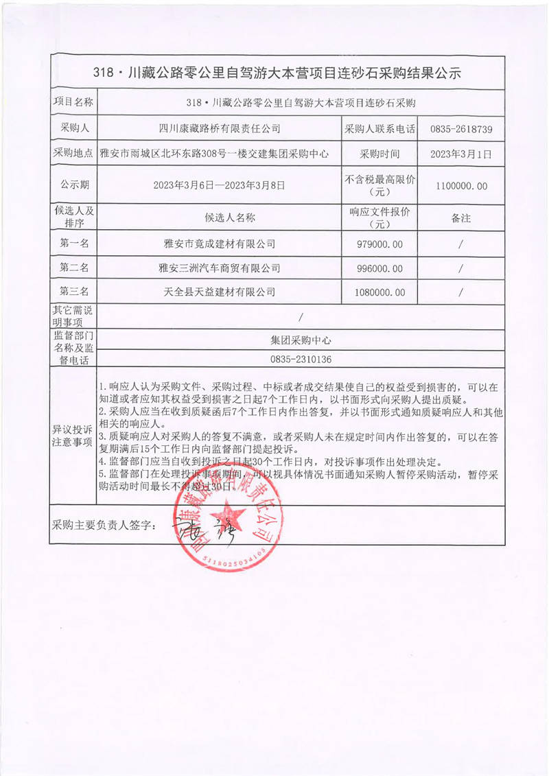四川康藏路橋有限責(zé)任公司318·川藏公路零公里自駕游大本營(yíng)項(xiàng)目連砂石采購(gòu)結(jié)果公示