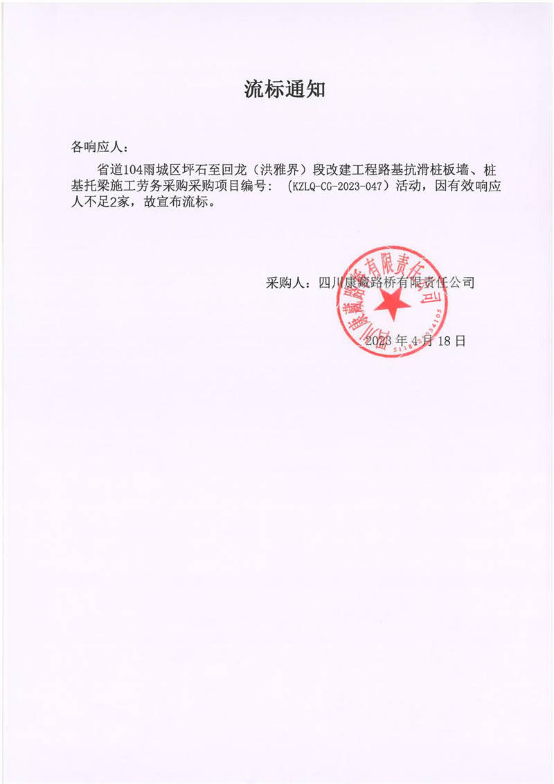 四川康藏路橋有限責(zé)任公司省道104雨城區(qū)坪石至回龍(洪雅界)段改建工程路基抗滑樁板墻、樁基托梁施工勞務(wù)流標(biāo)通知