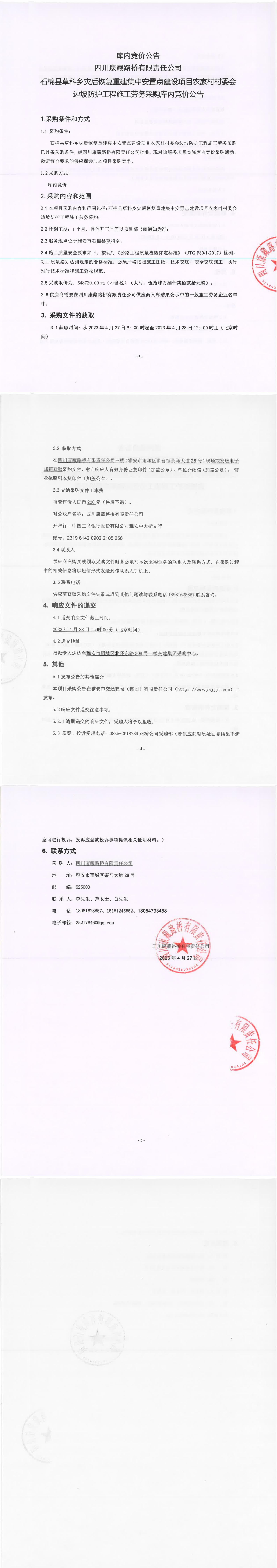 四川康藏路橋有限責(zé)任公司石棉草科鄉(xiāng)災(zāi)后恢復(fù)重建集中安置點(diǎn)建設(shè)項目農(nóng)家村村委會邊坡防護(hù)工程施工勞務(wù)采購采購庫內(nèi)競價公告