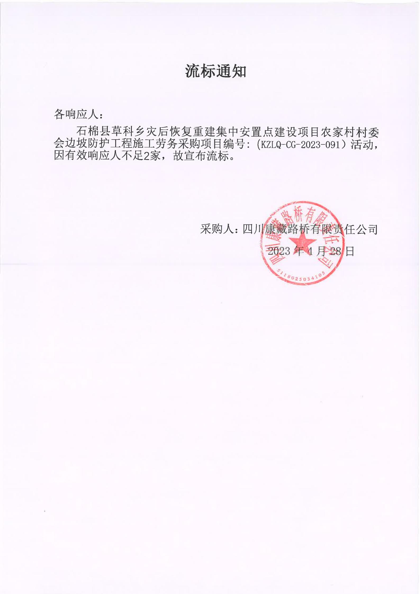 四川康藏路橋有限責(zé)任公司石棉草科鄉(xiāng)災(zāi)后恢復(fù)重建集中安置點(diǎn)建設(shè)項(xiàng)目農(nóng)家村村委會(huì)邊坡防護(hù)工程施工勞務(wù)流標(biāo)通知
