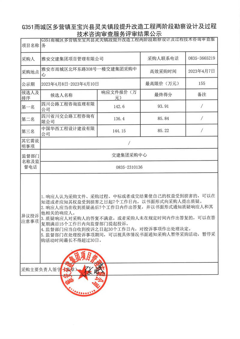雅安交建集團(tuán)項目管理有限公司G351雨城區(qū)多營鎮(zhèn)至寶興縣靈關(guān)鎮(zhèn)段提升改造工程兩階段勘察設(shè)計及過程技術(shù)咨詢審查服務(wù)評審結(jié)果公示