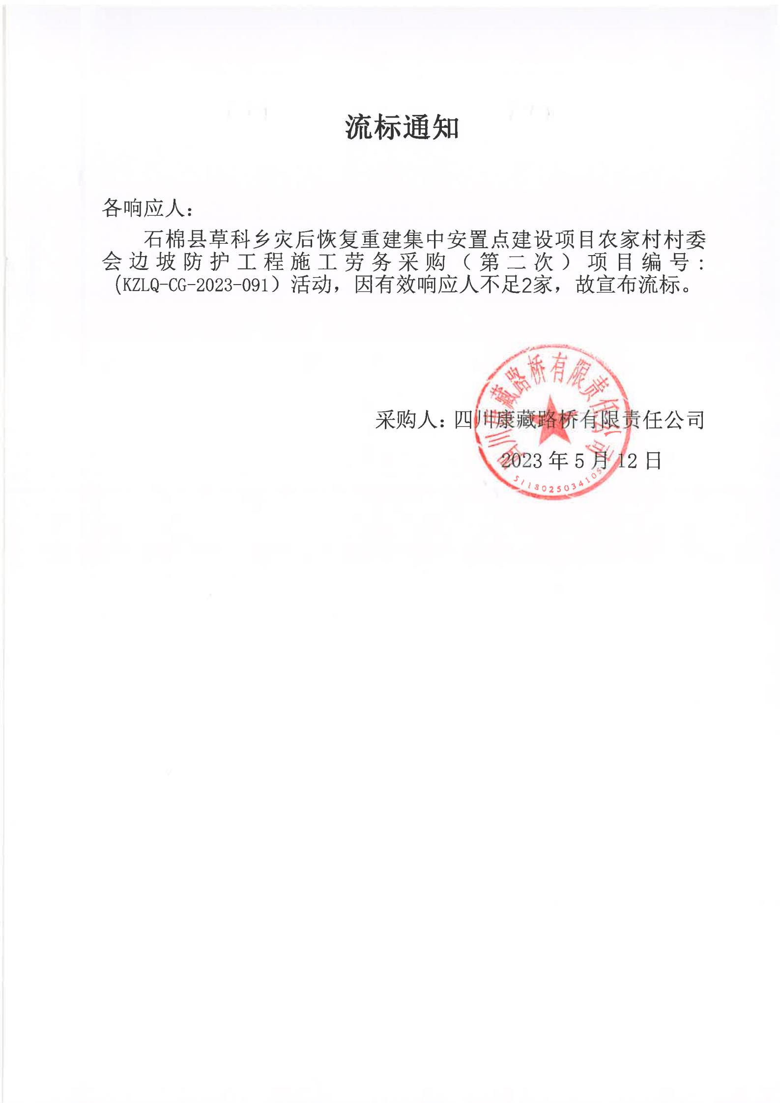 四川康藏路橋有限責(zé)任公司石棉草科鄉(xiāng)集中安置點建設(shè)項目農(nóng)家村村委會邊坡防護工程施工勞務(wù)采購(第二次)流標(biāo)通知