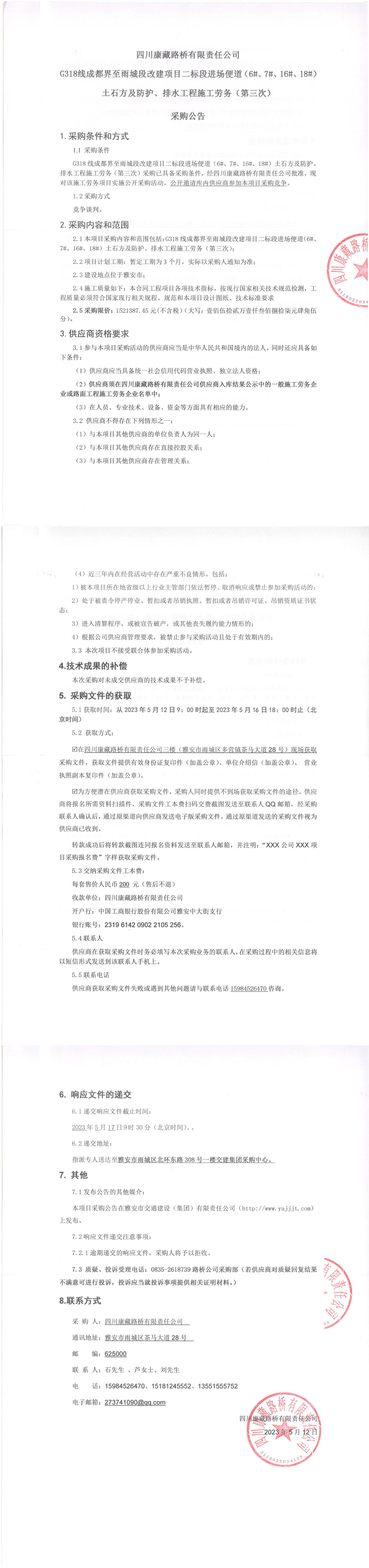 四川康藏路橋有限責(zé)任公司G318線成都至雨城段改建項(xiàng)目二標(biāo)段進(jìn)場(chǎng)便道(6#、7#、16#、18#)土石方及防護(hù)、排水工程施工勞務(wù)(第三次)采購公告