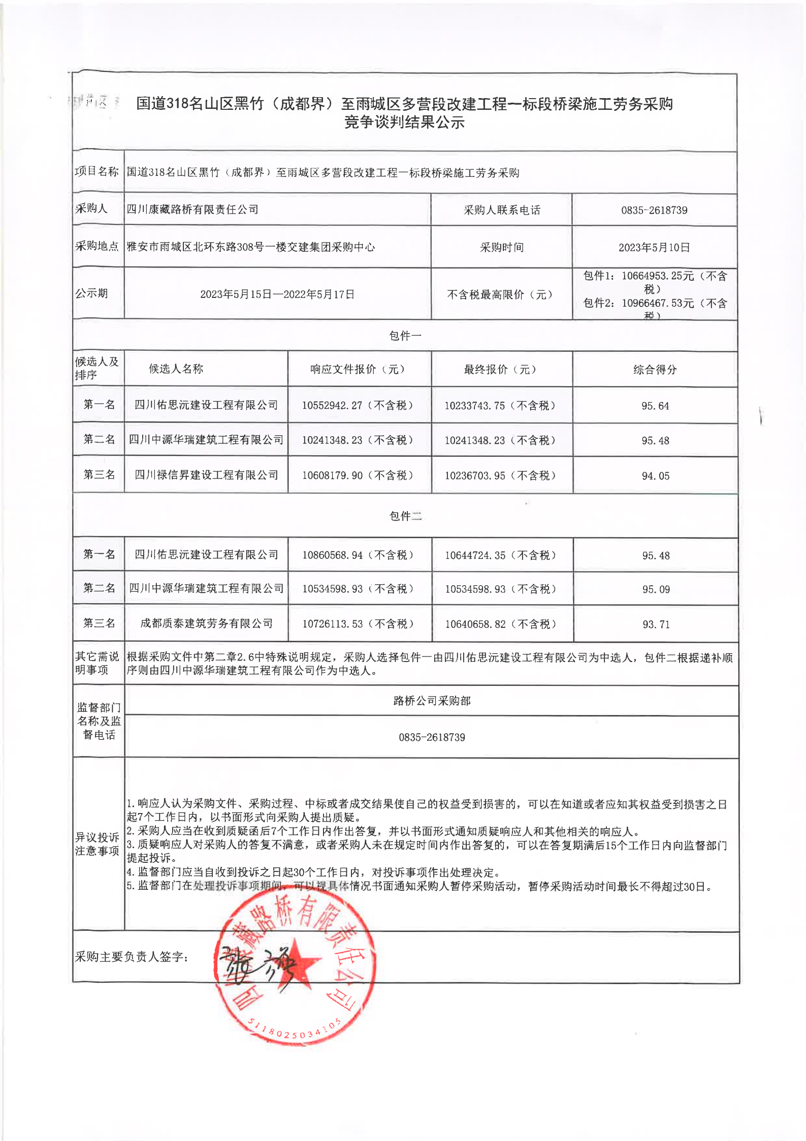四川康藏路橋有限責任公司國道318名山區(qū)黑竹(成都界)雨城區(qū)多營段改建工程一標段橋梁施工勞務(wù)采購競爭談判結(jié)果公示