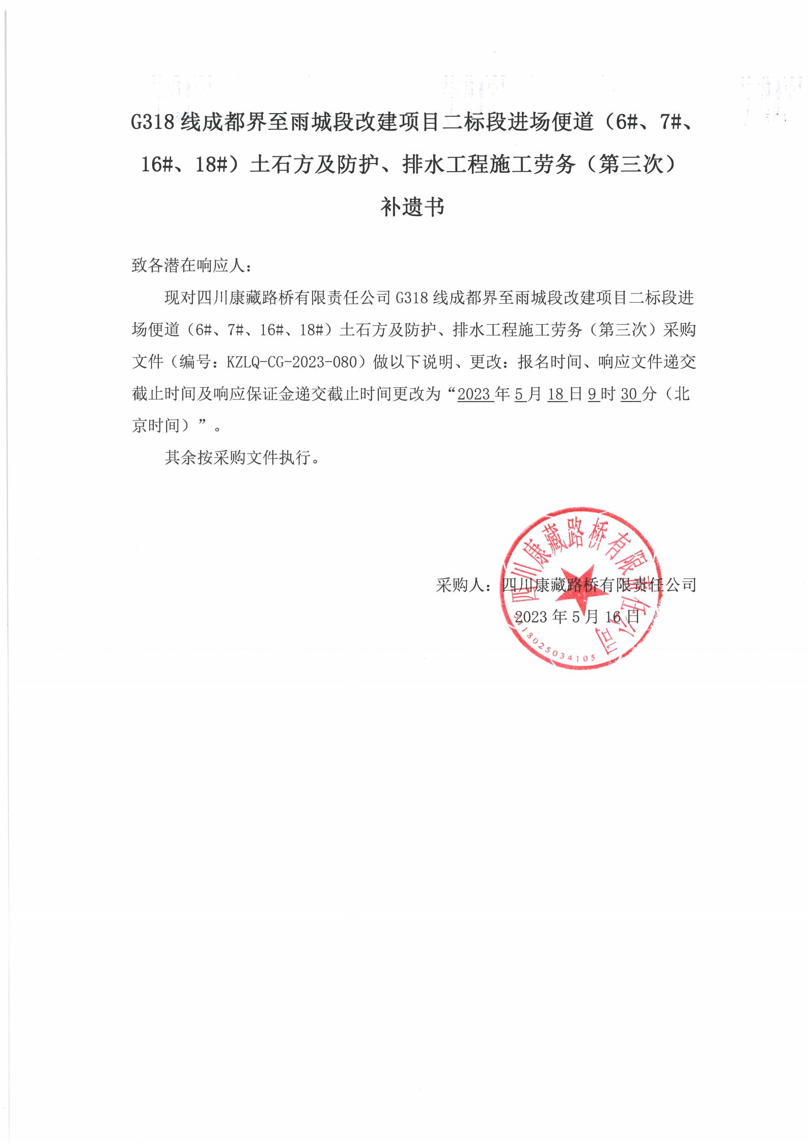 四川康藏路橋有限責(zé)任公司國道318名山區(qū)黑竹(成都界)至雨城區(qū)多營段改建工程二標(biāo)段橋梁下部構(gòu)造施工勞務(wù)(第二次)補(bǔ)遺書