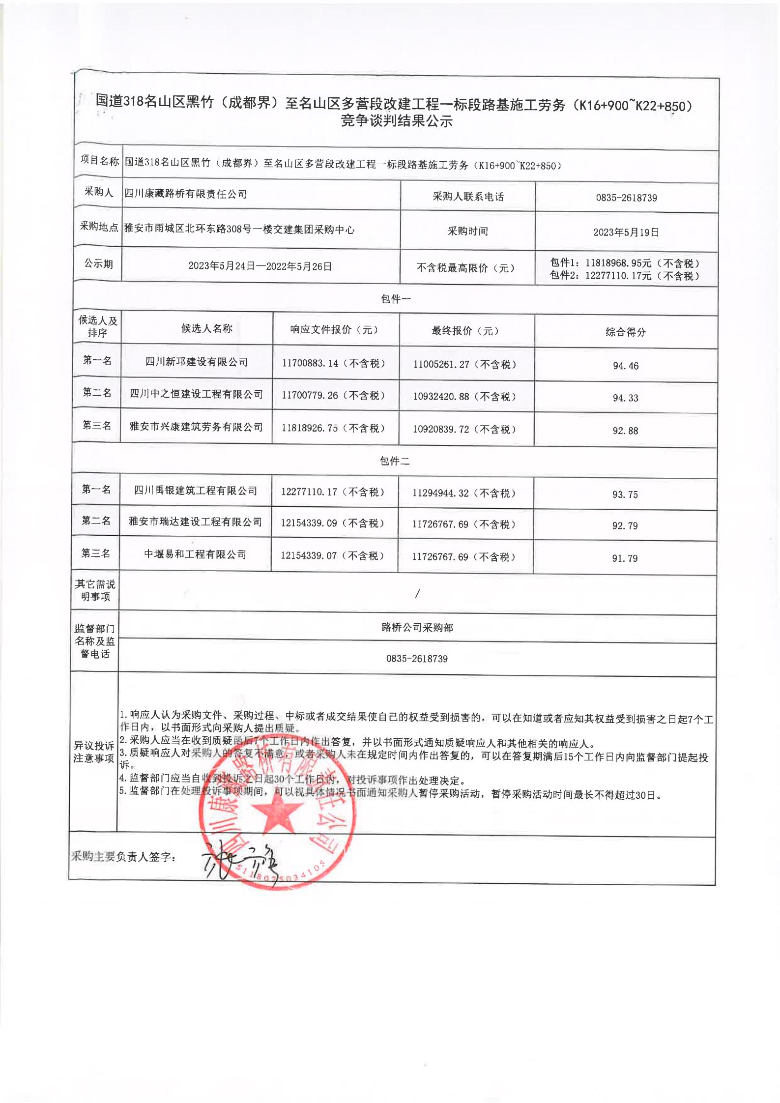 四川康藏路橋有限責(zé)任公司國道318名山區(qū)黑竹(成都界)至雨城區(qū)多營段改建工程一標(biāo)段路基施工勞務(wù)(K22+850~K26+604.5)競爭談判結(jié)果公示