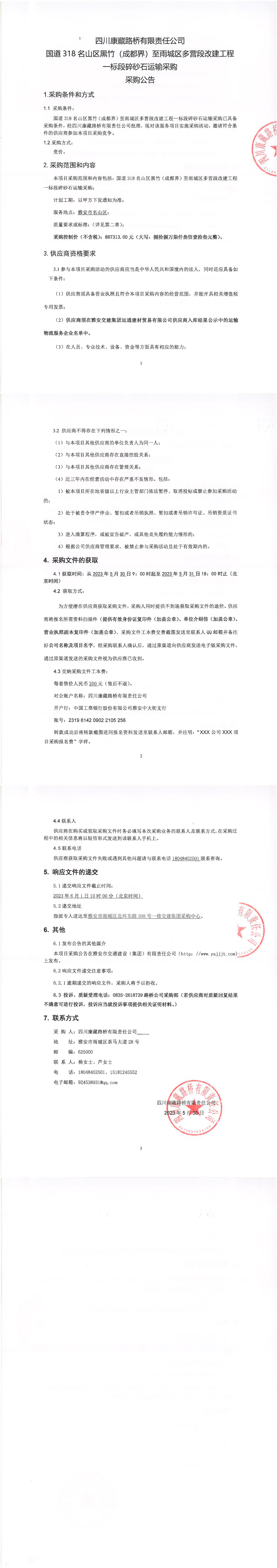 四川康藏路橋有限責(zé)任公司國道318名山區(qū)黑竹(成都界)至雨城區(qū)多營段改建工程一標(biāo)段碎砂石運輸采購補遺書(一)